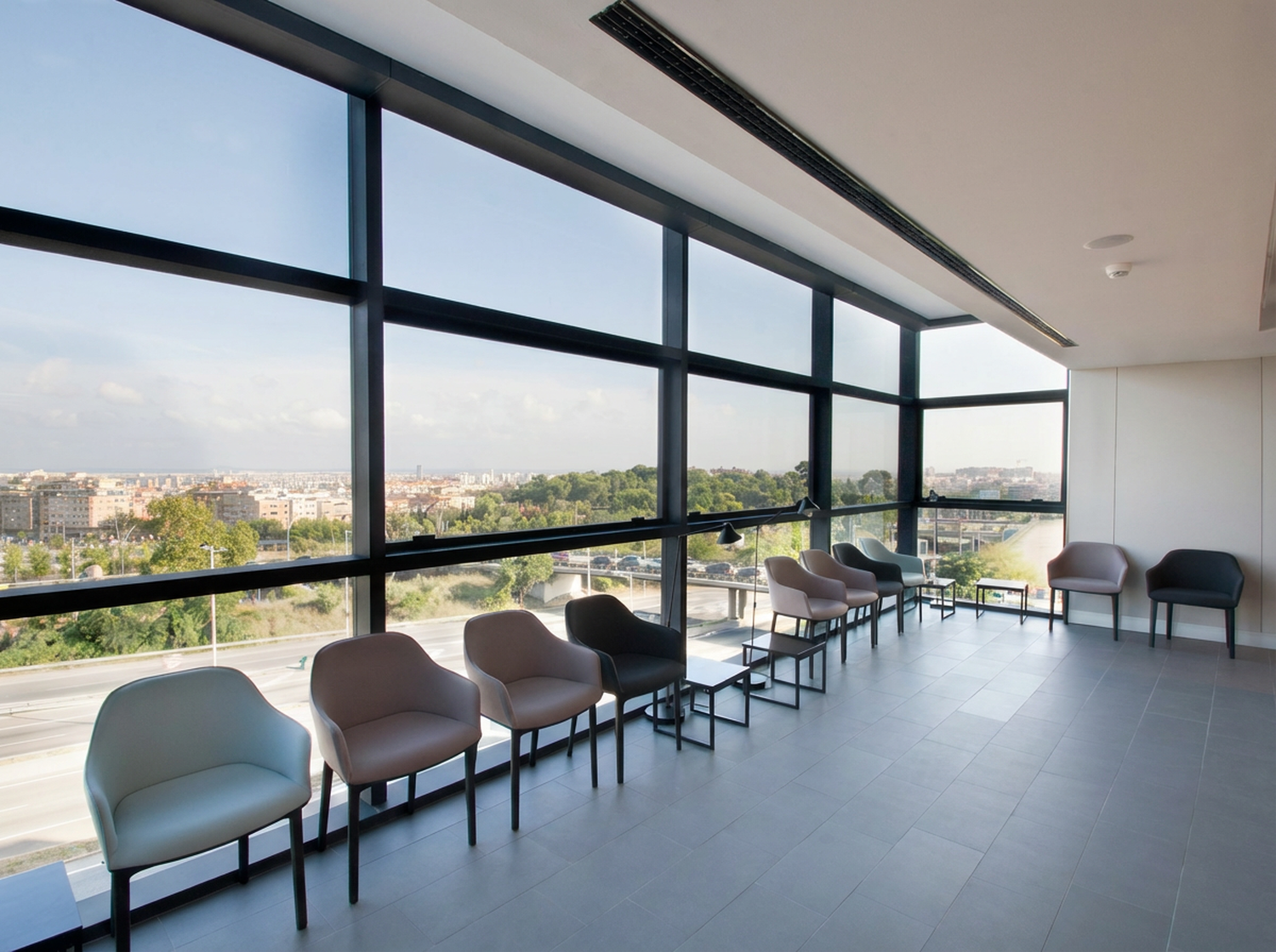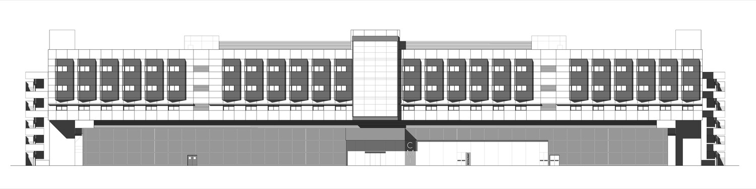 El edificio se concibe como una pieza horizontal que acompaña el trazado de la infraestructura y que actúa como una nueva fachada urbana visible desde la autopista. Al mismo tiempo, su implantación permite proteger los espacios interiores del ruido y de las condiciones ambientales asociadas al tráfico intenso.