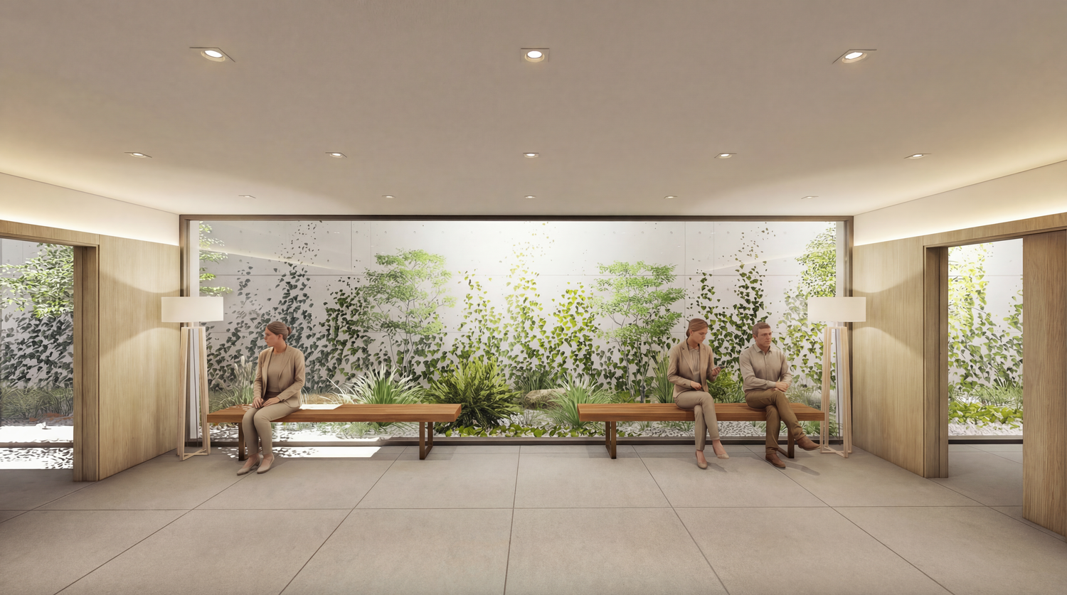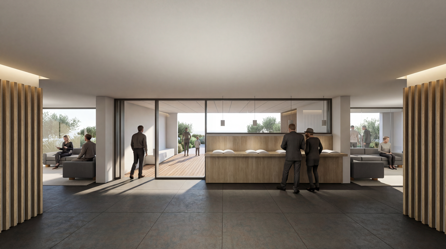 Los distintos usos se disponen en volúmenes diferenciados que mantienen una misma lógica formal y material. Una plaza de acceso actúa como antesala pública, separada del tráfico por un talud ajardinado que resuelve el desnivel. En el interior, circulaciones claras y patios de luz introducen iluminación natural y referencias constantes al paisaje, construyendo una atmósfera serena y legible.