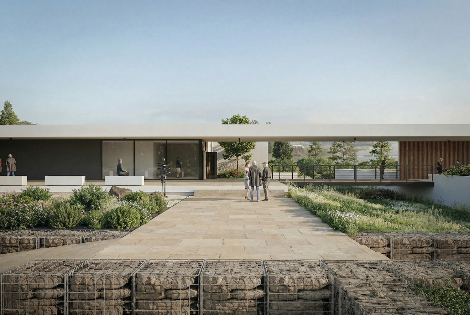 La ampliación mantiene el lenguaje arquitectónico y la horizontalidad del conjunto, integrándose en el paisaje. El nuevo volumen incorpora un oratorio y genera una plaza exterior de acceso que actúa como antesala. La intervención también reorganiza los recorridos y mejora los flujos del conjunto, diferenciando de forma más clara los usos públicos y de servicio. Paralelamente, el vestíbulo existente se adapta para convertirse en un hall de mayor dimensión que articula el funcionamiento del conjunto ampliado.
